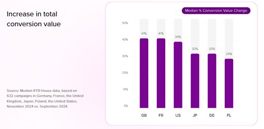 Z kolei na podstawie 632 kampanii przeprowadzonych na sześciu rynkach (Polska, Niemcy, Francja, Wielka Brytania, USA i Japonia) widać wyraźny wzrost skuteczności działań – w Polsce konwersja w listopadzie 2024 roku była aż o 29% wyższa niż we wrześniu.