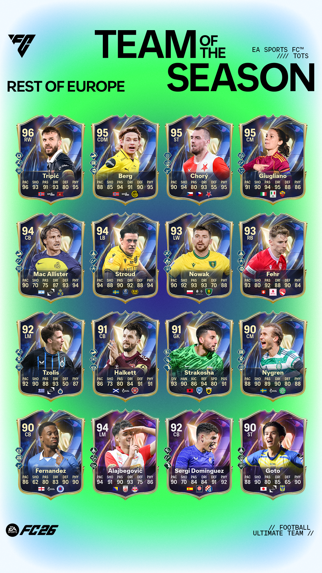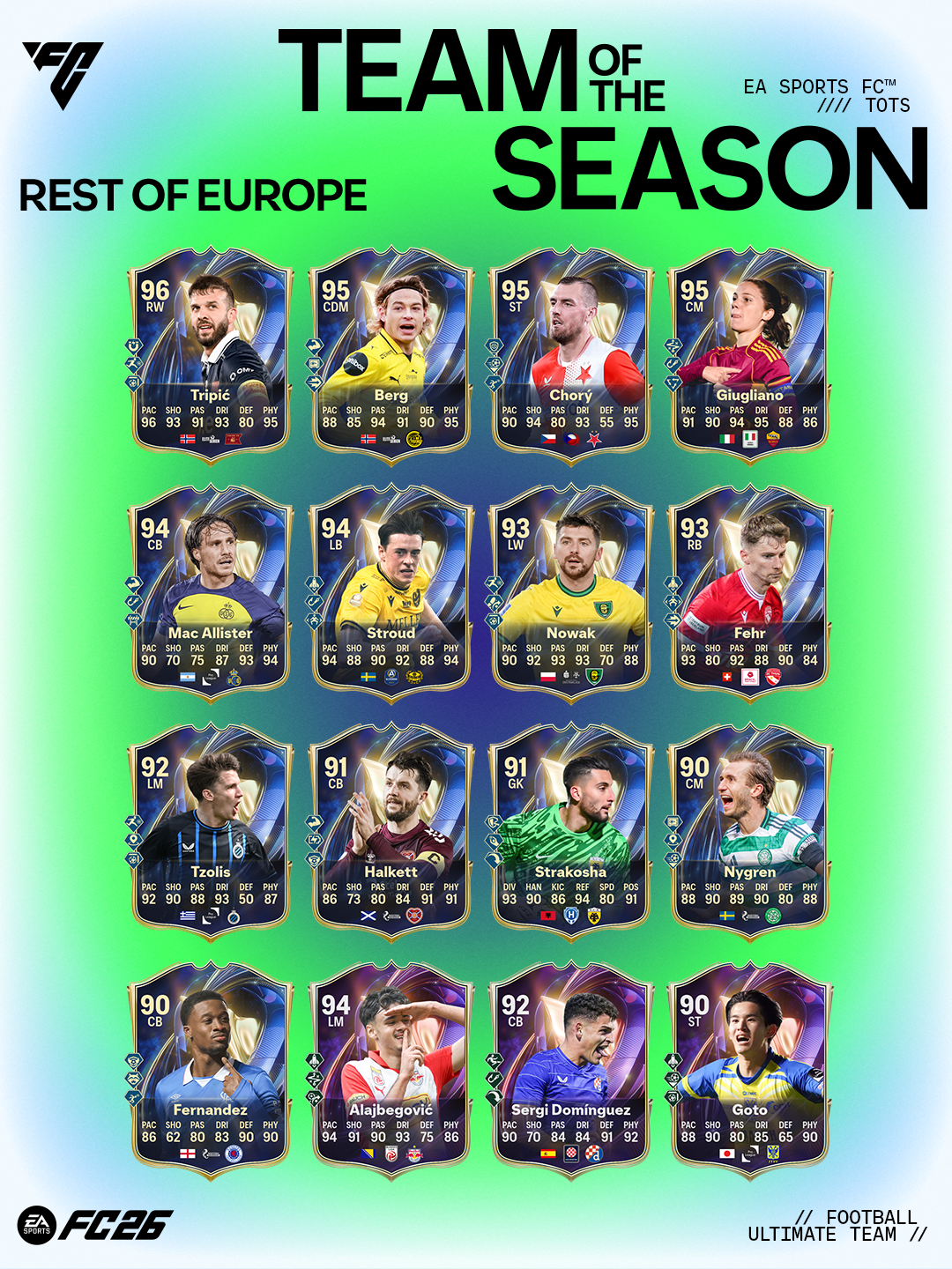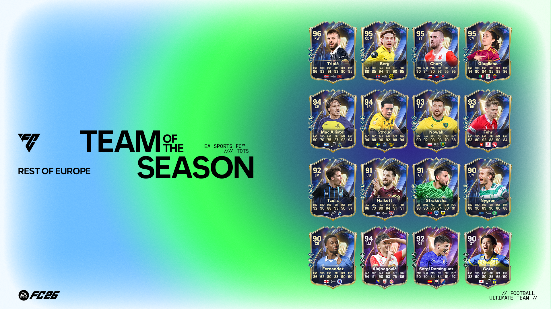 Składy Drużyny Sezonu ogłaszane są co tydzień w EA SPORTS FC 26 oraz EA SPORTS FC Mobile, a społeczność dołącza do rozmowy i debat na temat ostatecznych jedenastek za pośrednictwem kanałów społecznościowych EA SPORTS FC. Drużyna Sezonu Reszty Europy jest już dostępna w FC 26, a w FC Mobile będzie dostępna od 20 maja.