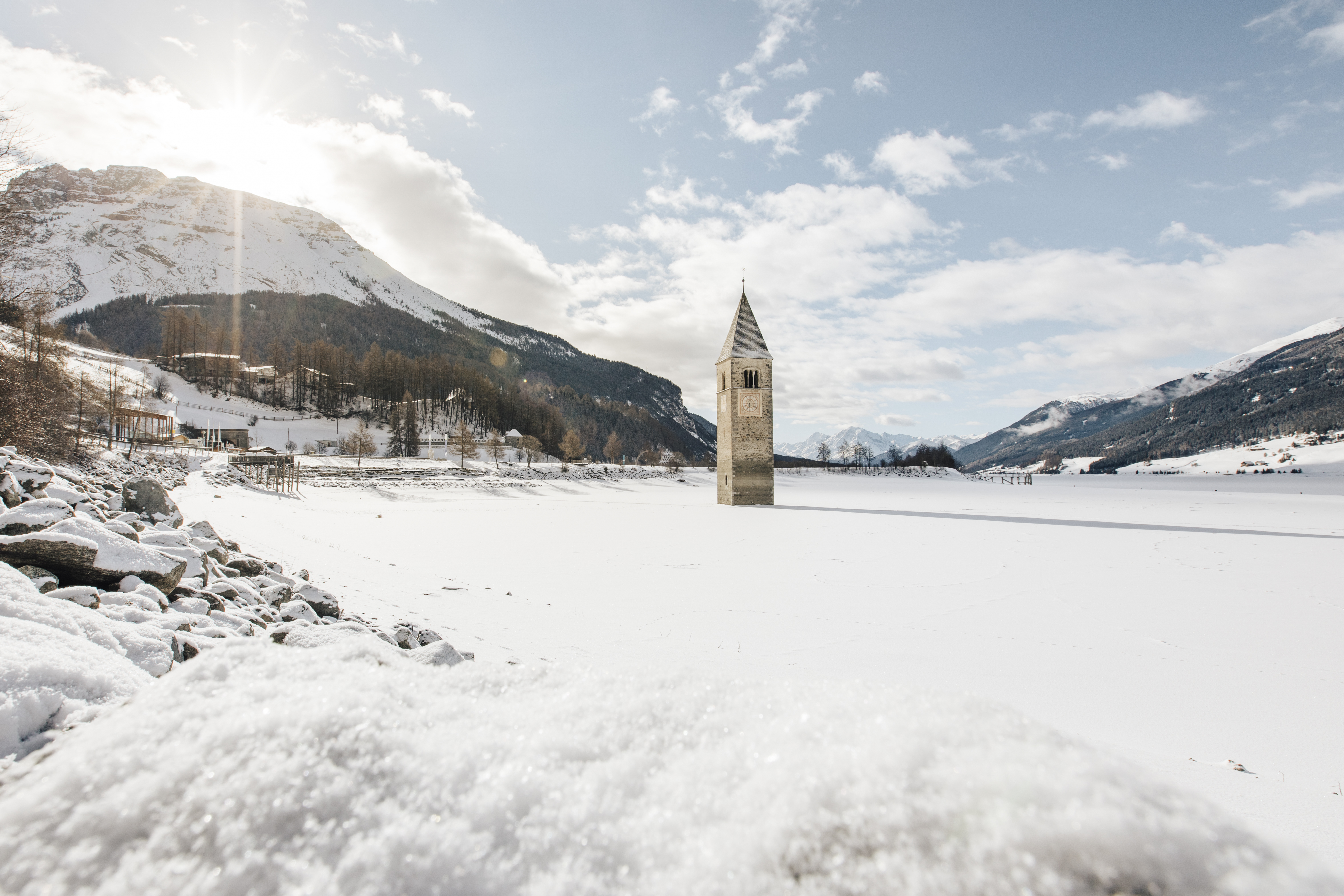 Znane jezioro Reschensee/Lago di Resia, charakteryzujące się wystającą z wody wieży kościelnej z zatopionego miasteczka, staje więcej niż miejscem do oglądania. W zimie do budowli można dojść na piechotę po lodowej tafli. Mieszkańcy wybierają się tu na łyżwy oraz zimowe wędrówki. O świcie i o zmierzchu jezioro przyciąga osoby szukające ciszy, a otoczona ośnieżonym krajobrazem dolina Vinschgau/Val Venosta ukazuje się wtedy w wyjątkowym świetle.