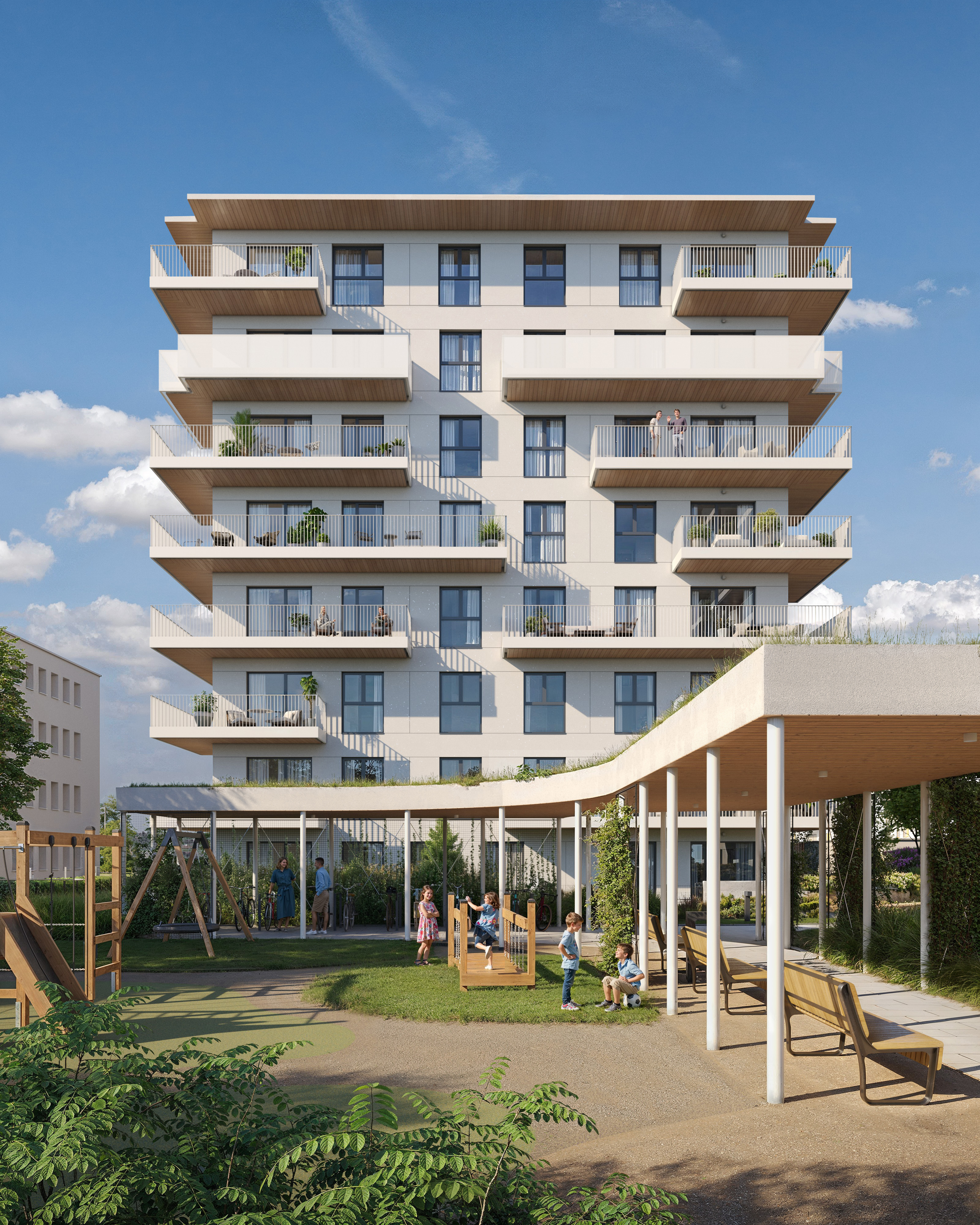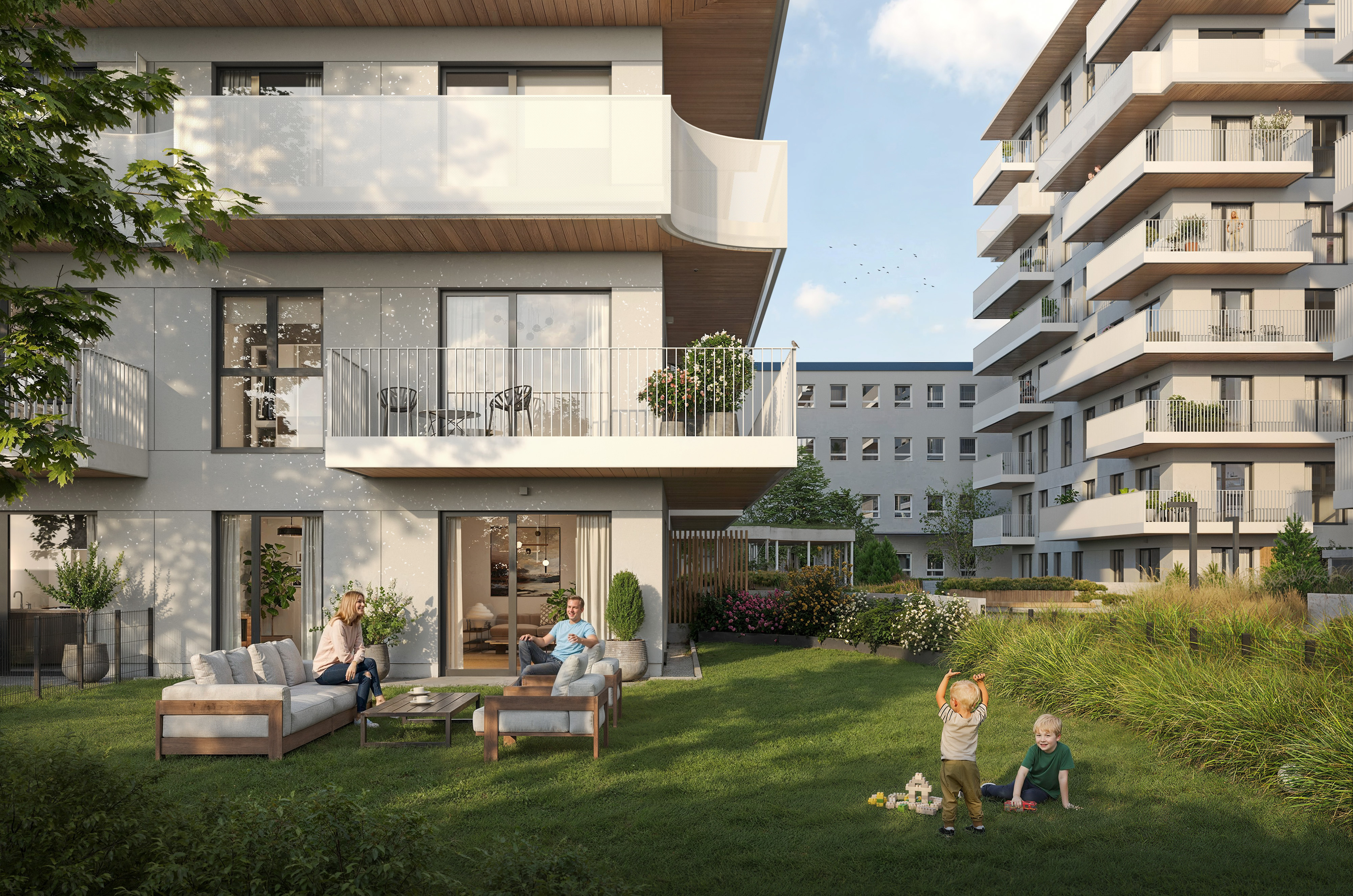 Założeniem projektu jest stworzenie czytelnych i przyjaznych przestrzeni wspólnych, które będą sprzyjać codziennym kontaktom sąsiedzkim. Przestrzenie te zróżnicowano - od miejsc o spokojnym, wypoczynkowym charakterze, przez strefy rekreacyjne, aż po obszary przeznaczone do aktywności fizycznej, w tym siłownię plenerową. Uzupełnieniem całości są elementy małej architektury, takie jak ławki, plac zabaw, urządzenia rekreacyjne czy pawilon terenowy.