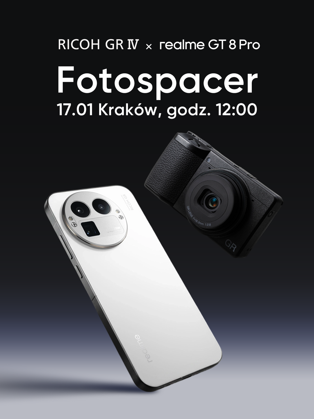 Warszawa, 5 stycznia 2026 r. – Marki realme i RICOH łączą siły, by 17 stycznia 2026 roku o godzinie 12 zaprosić pasjonatów pięknych kadrów na wyjątkowy fotospacer po Krakowie. Jest to niepowtarzalna okazja, by w rzeczywistych warunkach przetestować nie tylko najnowszy flagowiec realme GT 8 Pro, wprowadzony na polski rynek w grudniu 2025 roku, ale także kultowy aparat RICOH GR IV. Dzięki temu uczestnicy będą mogli przekonać się, jak fotograficzna tradycja łączy się z przyszłością cyfrowego obrazowania.