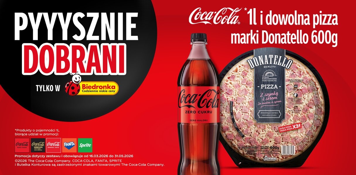 Oferta jest już dostępna we wszystkich ponad 3800 sklepach sieci Biedronka. Promocja jest częścią platformy Coke & Meal, która w prosty sposób łączy kultowe smaki napojów Coca-Cola z daniami idealnie pasującymi do ich charakteru. To pomysły stworzone z myślą o tych momentach, kiedy chcemy po prostu dobrze zjeść i jeszcze lepiej celebrować smak.